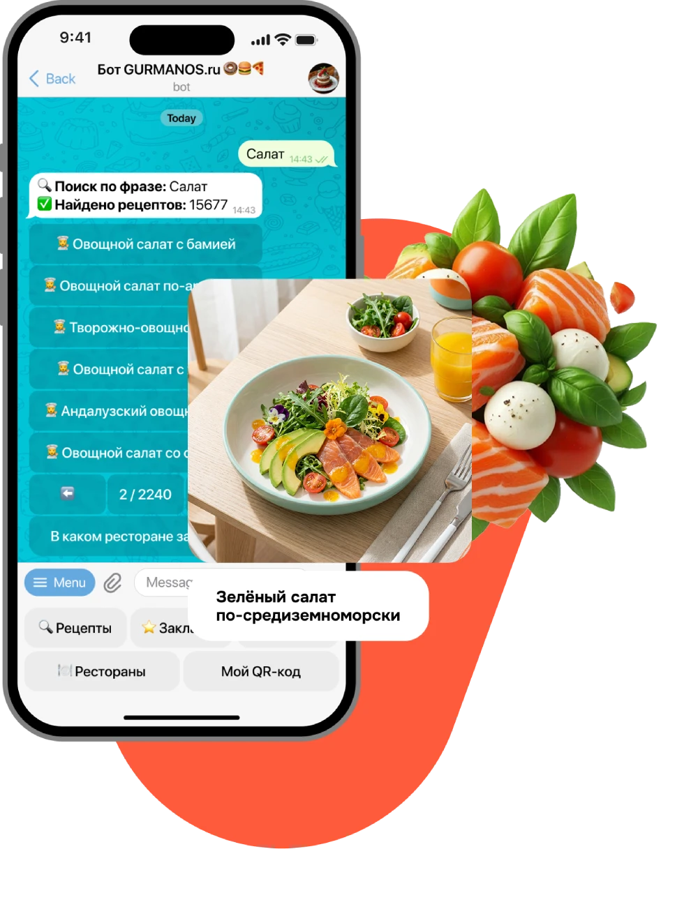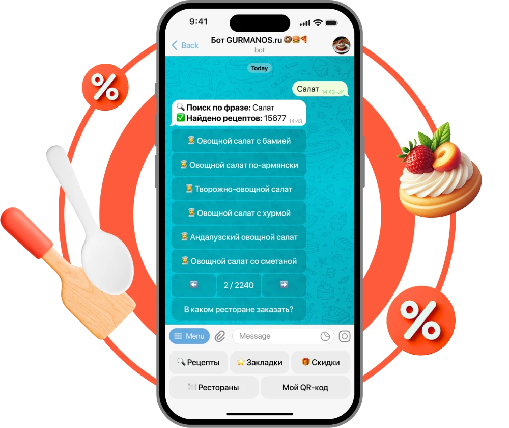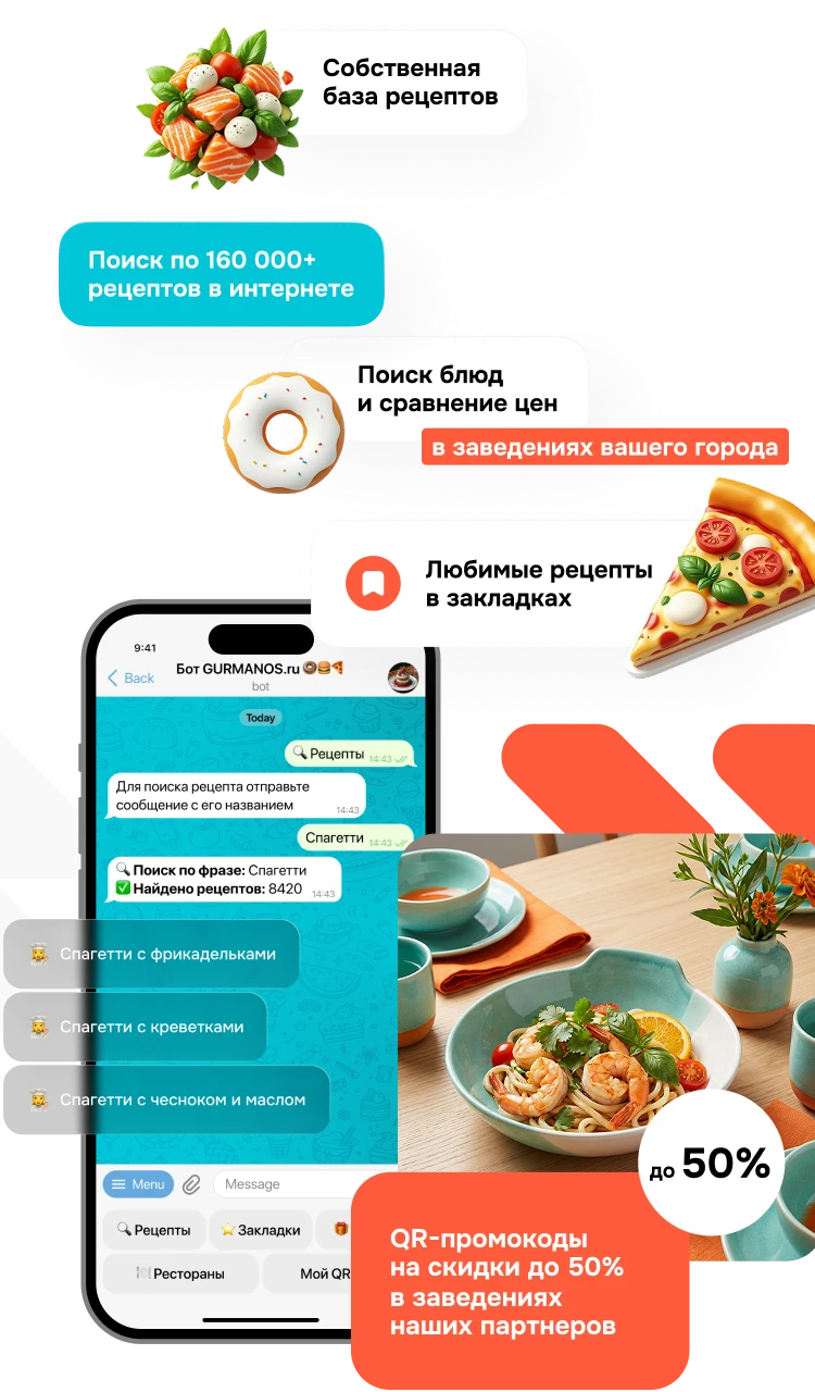 Подпишись на бота Gurmanos и получи QR-код на скидки до 50% в заведениях-партнерах по всей России